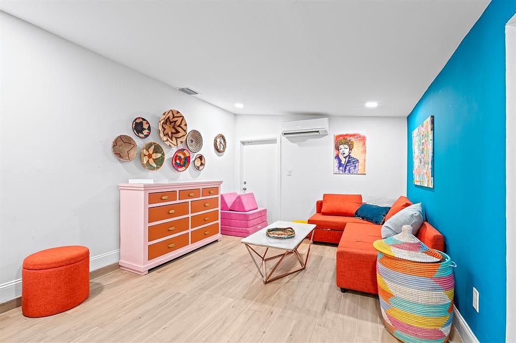 A lively rec room featuring a bright and playful color scheme, with a striking turquoise blue accent wall embossed with a geometric pattern. Furnished with a bold orange sectional sofa and a coordinating orange chair, both accented by white throw pillows and a round yellow pouf. The space includes a glass coffee table, a clear acrylic bar with matching stools topped in hot pink, and whimsical wall art that adds to the youthful energy. Light wood-look tile flooring gives a warm contrast, while recessed ceiling lights ensure the room is evenly illuminated. Pops of color and modern decor create a welcoming, energetic atmosphere.