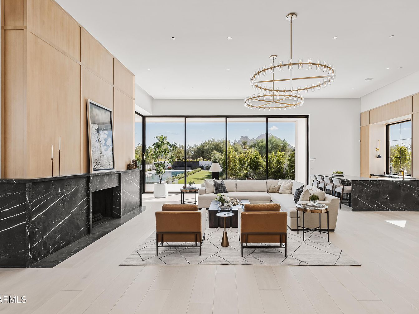 The spacious living room features a modern aesthetic with an open layout that encourages natural light. Neutral tones dominate the design, highlighted by pale wooden flooring and light-colored walls. Two circular chandeliers suspended from the ceiling add a touch of elegance. A large, L-shaped sectional sofa is accented with plush cushions, providing comfort. Adjacent, stylish armchairs surround a sleek, circular coffee table, creating a cozy conversation area. The striking black marble fireplace serves as a focal point, complemented by a wooden panel backdrop, while expansive glass doors frame views of a manicured outdoor space.