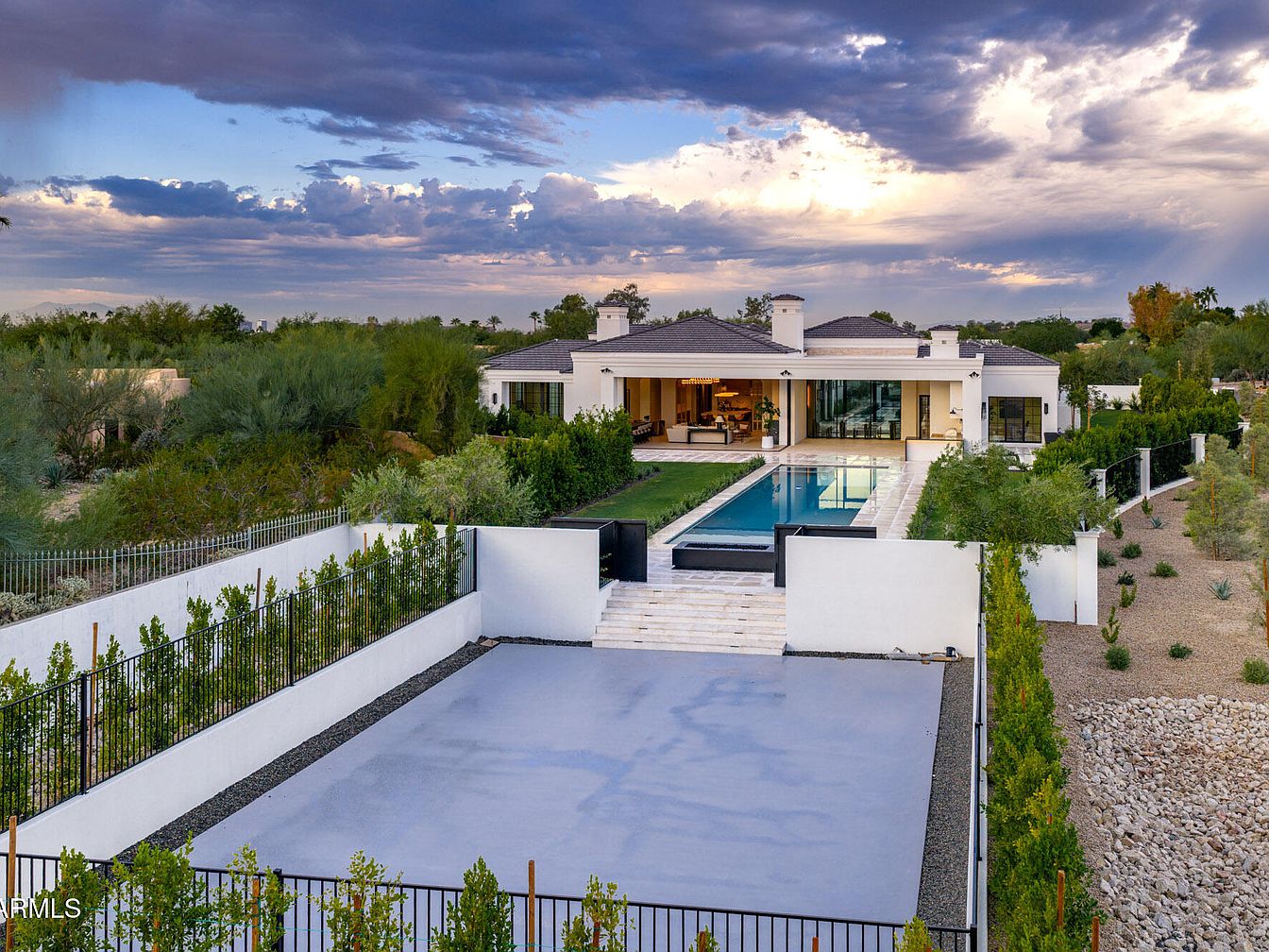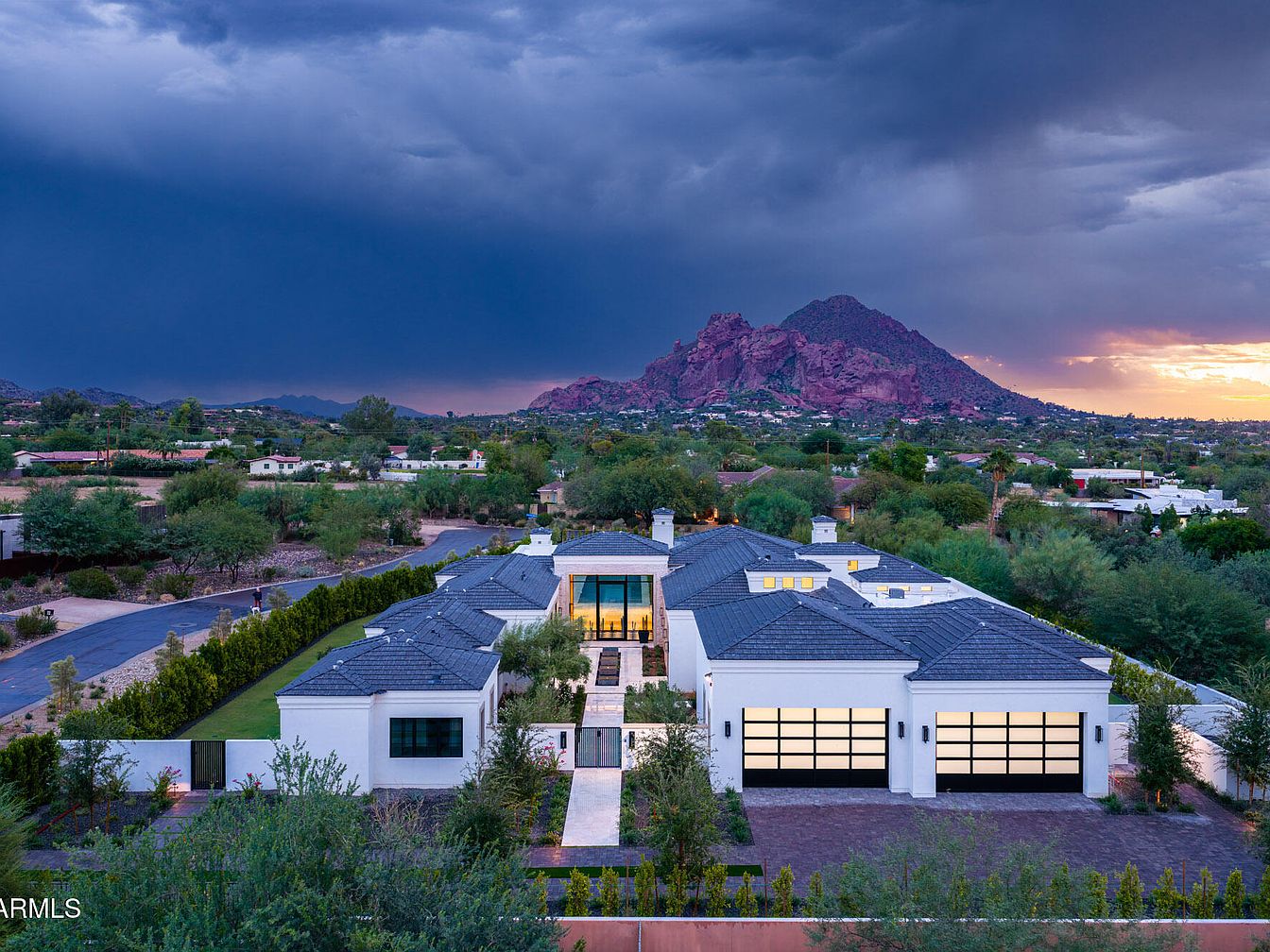 This exquisite estate, set in the prestigious Paradise Valley, AZ, showcases a modern architectural style with a seamless blend of luxury and functionality. With a listing price of $10 million and nearly one acre of land, it boasts breathtaking views of Camelback Mountain and Piestewa Peak. Recently constructed, it features a grand courtyard, open-concept living spaces, a chef’s kitchen with high-end appliances, and a private primary suite. Highlights include a wellness area with a gym, sauna, and cold plunge, alongside a resort-style backyard equipped with a heated pool, outdoor shower, and pickleball court. This remarkable home exemplifies sophisticated living, located near exclusive resorts, shopping, and dining options.