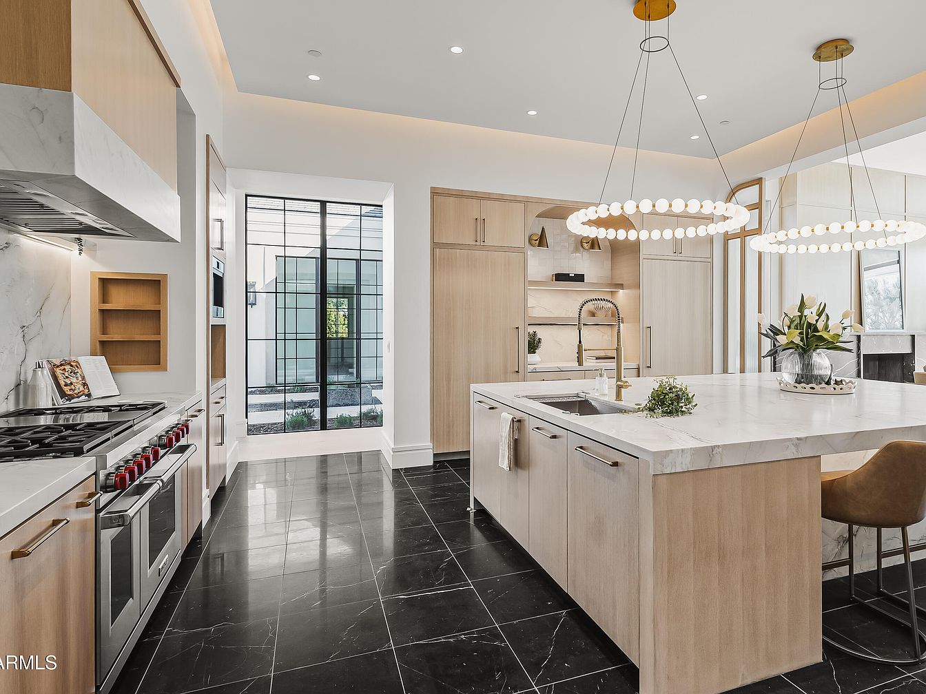 Modern kitchen design with a sleek, open layout featuring light wood cabinetry and a large, elegant island topped with white marble. Two circular pendant lights hang above the island, creating a warm ambiance. High-end stainless steel appliances, including a gas range with red knobs, offer a professional touch. Black tile flooring adds a striking contrast to the light cabinetry. A large window allows natural light to flood the space, while providing a view of the outdoor garden. Minimalistic design elements enhance the spacious feel, making it both functional and visually appealing. Perfect for culinary creativity.