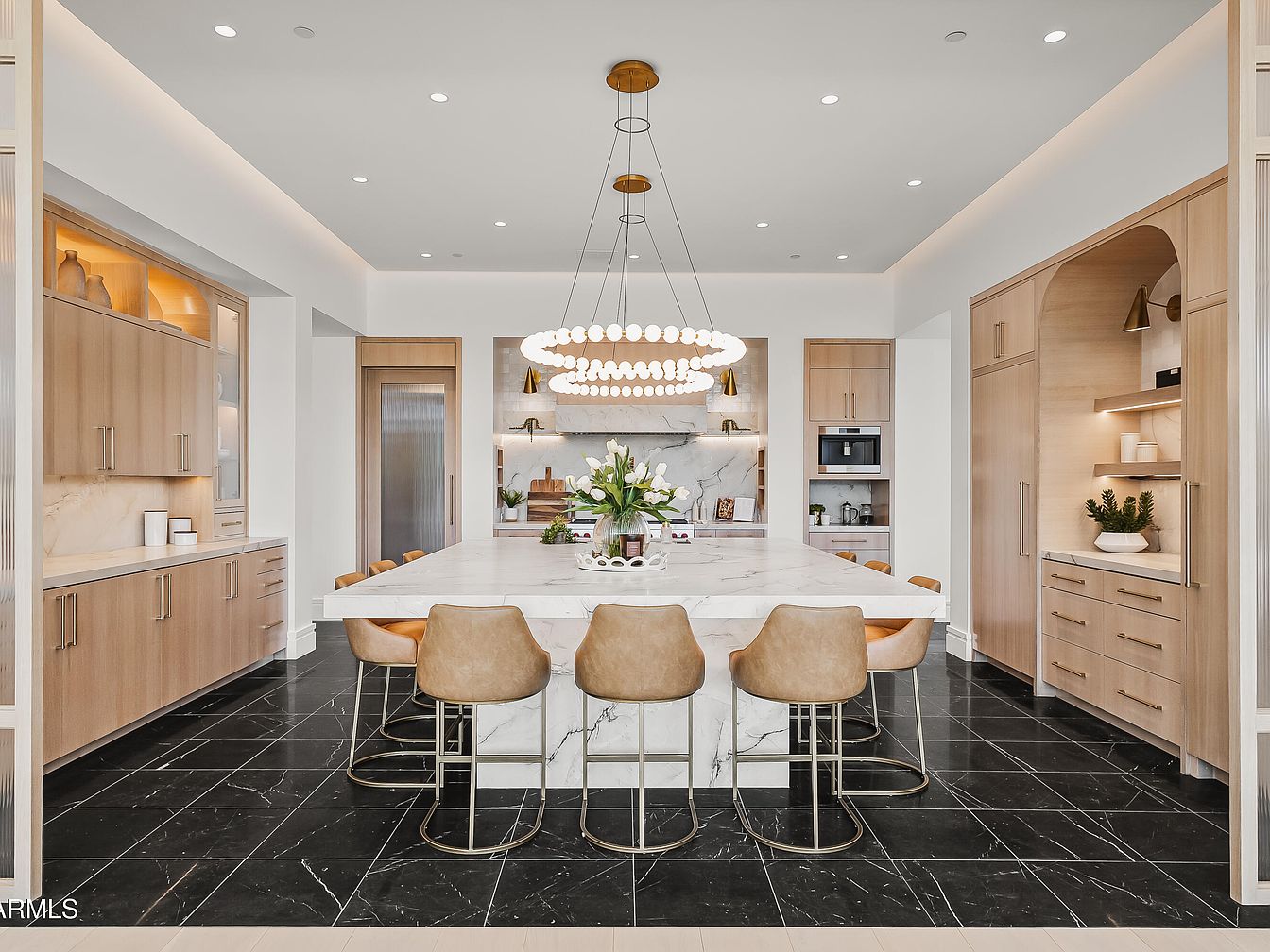 A modern kitchen featuring a spacious island with a large marble countertop as its centerpiece. The island is lined with sleek, soft brown bar stools, inviting casual dining. Surrounding cabinetry in light wood contrasts beautifully with the black marble floor, showcasing a sophisticated color palette of neutrals and dark tones. Ambient lighting from a statement chandelier enhances the airy feel, with recessed lights adding extra brightness. The walls are adorned with elegant cabinetry, highlighted by glass display sections. Nearby, stainless steel appliances integrate seamlessly into the design, emphasizing modern functionality and aesthetic harmony.