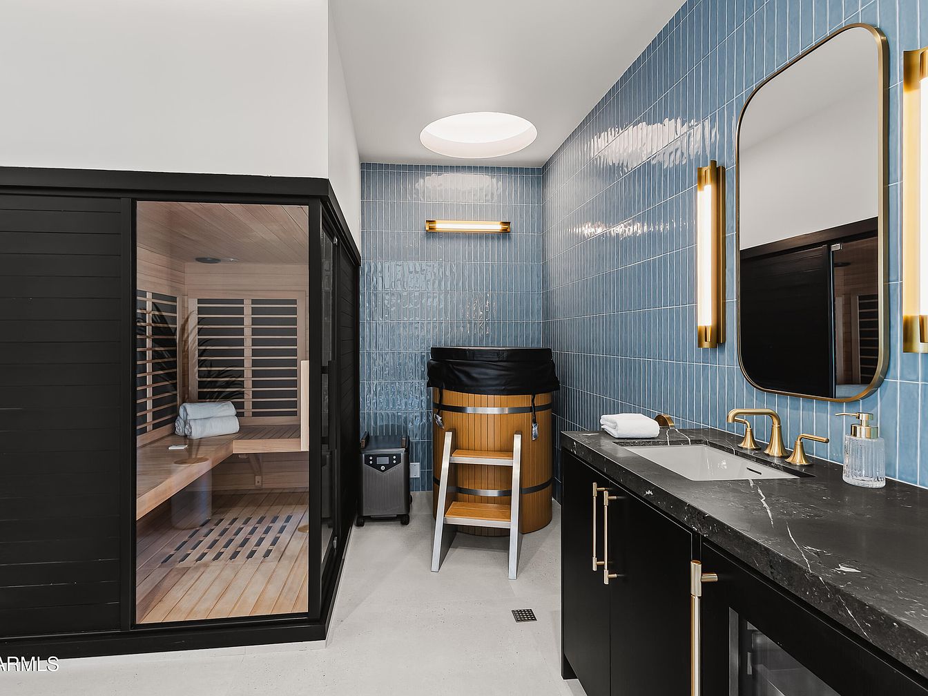 This spa-like bathroom features a combination of sleek modern and natural elements. The walls are adorned with glossy blue tiles that catch the light, enhancing the serene atmosphere. A glass-enclosed sauna in black provides an inviting contrast, while a wooden barrel hot tub adds a touch of warmth. The cabinetry is finished in black, with a luxurious dark marble countertop showcasing a modern sink and stylish gold faucet. Two oval mirrors, accented with gold frames, flank the light fixtures, creating an elegant symmetry. Natural light floods in from a skylight, amplifying the tranquil ambiance.