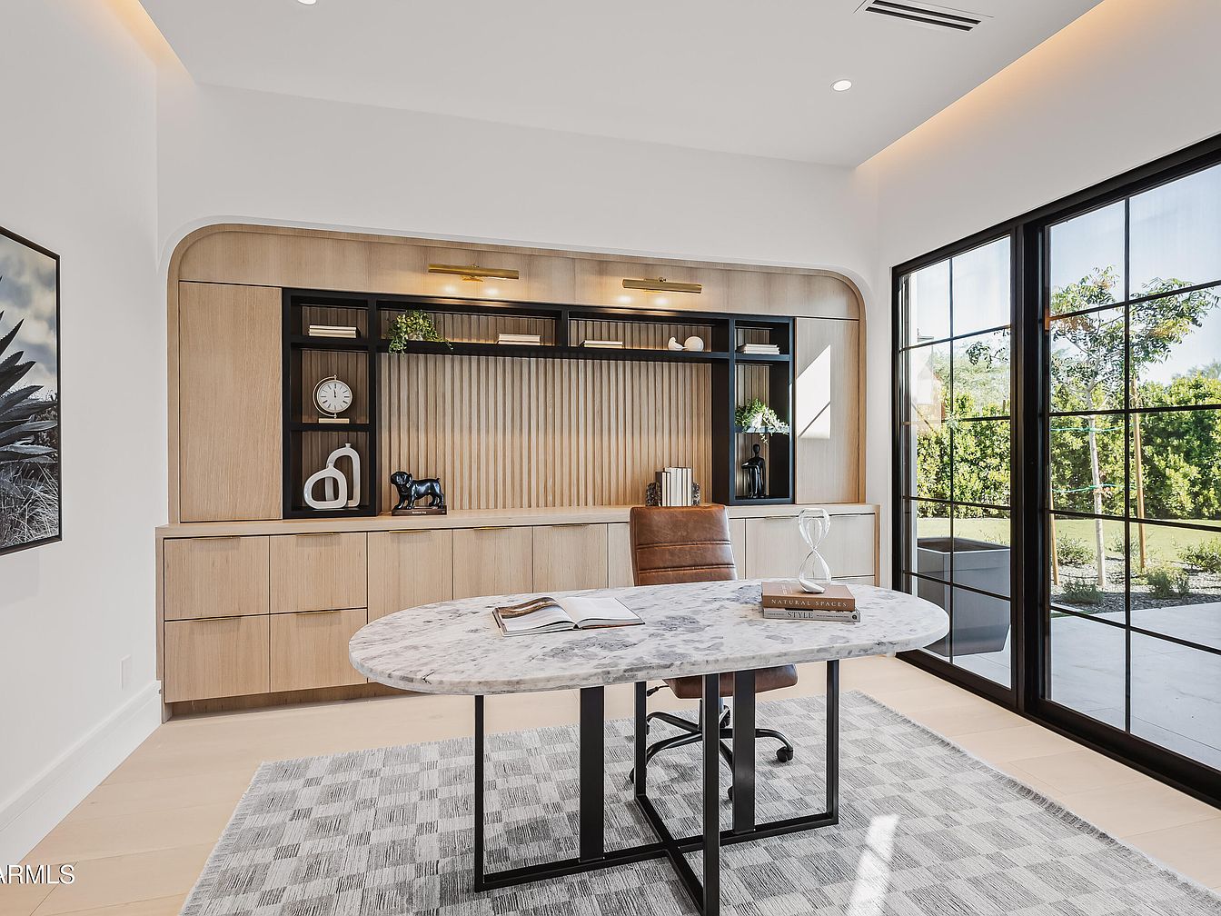 This home office features a sleek, modern design characterized by a smooth marble desk positioned center stage. The desk is supported by a black frame, complementing the contemporary aesthetic. Behind the desk, built-in cabinetry combines light wood tones with dark shelving, accented by warm lighting that highlights decorative items and a wall clock. A plush leather office chair offers comfort, while floor-to-ceiling windows invite abundant natural light, framed by minimalistic black frames. The floor is adorned with a textured area rug, enhancing coziness, and a neutral color palette of whites and browns contributes to a serene workspace environment.
