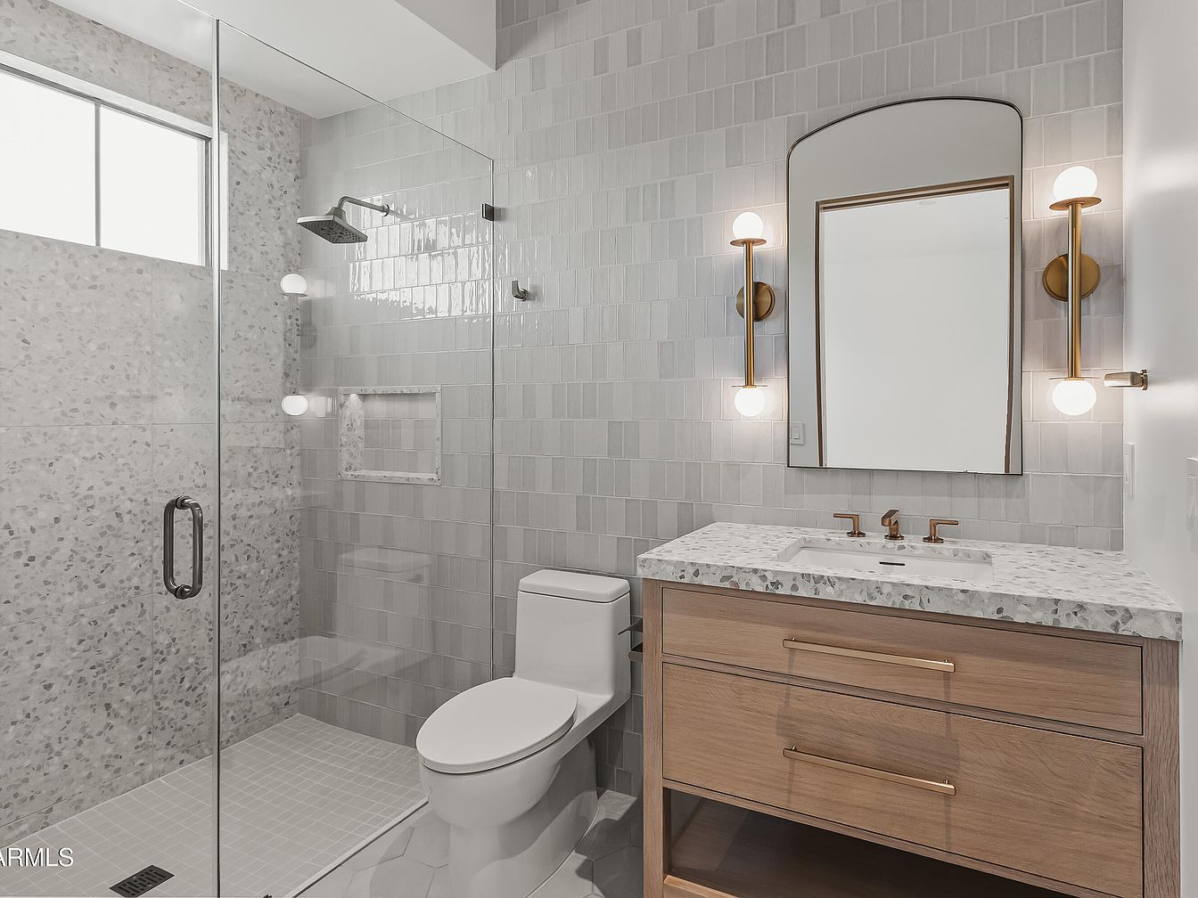 This modern bathroom showcases a sleek design with elegant fixtures. A spacious glass shower features a rain showerhead and minimalist tile in light gray and off-white hues. The walls are adorned with textured tiles, creating a harmonious backdrop. A stylish wood vanity sits beneath an arched mirror, complemented by brass fixtures and soft globe lighting, adding warmth to the space. The countertop features a subtle speckled pattern, enhancing the contemporary aesthetic. The minimalistic layout and careful choice of materials foster a serene atmosphere, perfect for relaxation and rejuvenation.