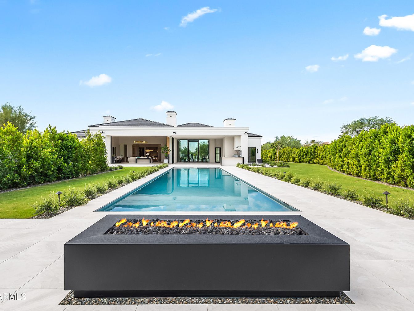 An inviting outdoor area featuring a sleek, modern pool that reflects a clear blue sky. Centered in the foreground is a contemporary firepit, its flames dancing over black lava stones, adding warmth and ambiance. The poolside is bordered by elegant, large-format tiles in neutral tones, seamlessly integrating with the green landscaping around. Lush hedges line the perimeter, providing privacy and a vibrant backdrop. The spacious home, visible in the distance, boasts a refined architectural style with a well-defined roofline and large glass doors, enhancing the connection between indoor and outdoor living. The overall aesthetic is clean and sophisticated.