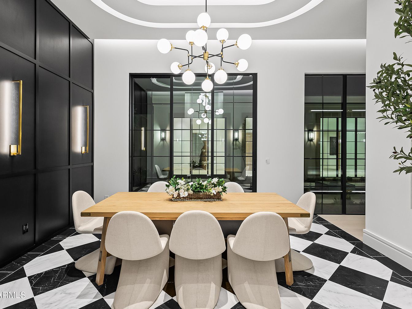 An elegant dining room featuring a stylish wooden table surrounded by soft, rounded chairs. The color palette blends warm browns of the table with the neutral tones of the upholstered chairs. A striking geometric black and white marble floor adds a bold touch, contrasting against the sleek, matte black accents on the walls. Lighting is provided by a contemporary chandelier with white globes, which complements the soft ambient glow from wall sconces. Large glass panels in the background invite natural light in, integrating the indoor space with the serene outdoor environment.
