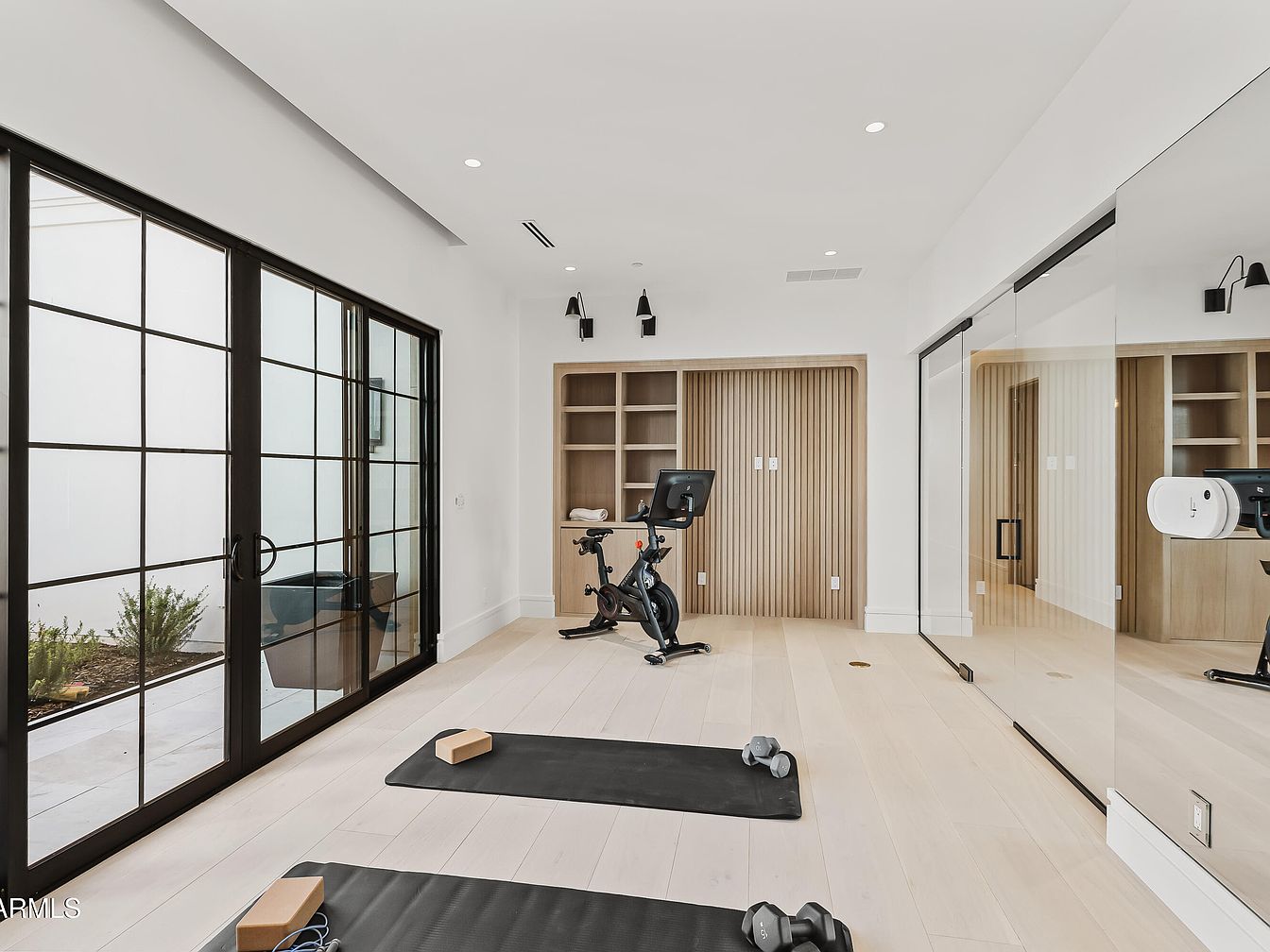 An airy home gym features large black-framed windows that invite natural light, enhancing the room’s spacious feel. Light wood flooring pairs harmoniously with a white color scheme, creating a modern and inviting atmosphere. In the center, exercise mats and weights indicate a functional workout space. A sleek stationary bike stands beside an elegantly designed wooden storage cabinet, showcasing a textured feature wall. Mirrored panels amplify the room’s brightness and extend the visual space, while minimalist wall-mounted lighting adds a contemporary touch, ensuring the environment is both practical and aesthetically pleasing for fitness activities.