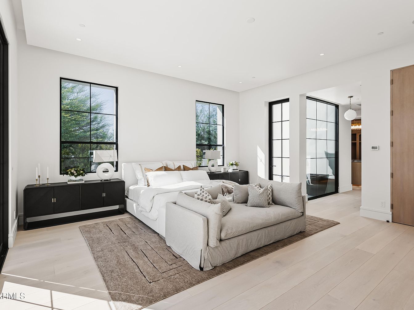 The master bedroom features a bright, spacious layout with minimalist aesthetics. Large, black-framed windows allow natural light to flood in, highlighting soft white walls and light wood flooring. A plush area rug lies beneath a contemporary bed adorned with neutral bedding and decorative pillows, adding texture. A sleek black sideboard sits against one wall, complemented by a modern sculpture and a small potted plant for a touch of greenery. Architectural details include subtle recessed lighting and a smooth ceiling, creating an inviting atmosphere. The adjoining doorway leads to an en-suite space, enhancing functionality.