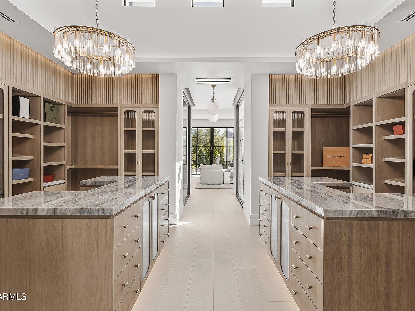 This spacious walk-in closet features dual islands topped with stunning marble surfaces, enhancing its luxury appeal. Rich wooden cabinetry lines the walls, complemented by vertically ribbed panels that add texture. Elegant crystal chandeliers illuminate the space, reflecting light and creating an inviting atmosphere. Organized shelving displays select fashion items, including branded boxes, emphasizing a curated aesthetic. A large window at the far end invites natural light, while the smooth, pale flooring creates a seamless flow. The overall design marries functionality with sophisticated elegance, suitable for stylish storage and display, epitomizing modern luxury living.