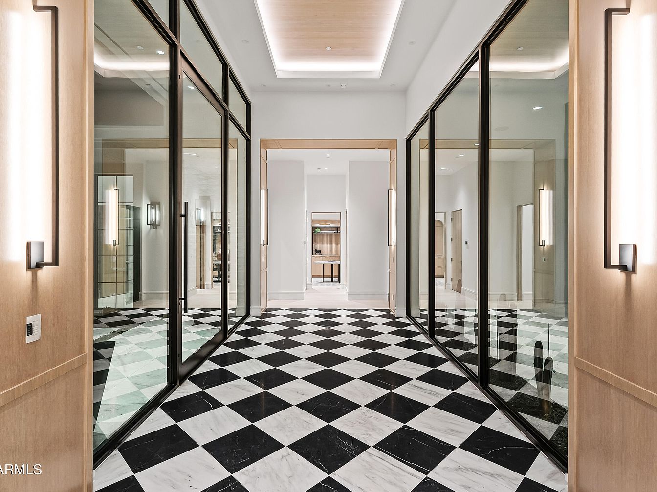 The entryway features a striking black and white checkered floor that combines marble and stone, establishing a luxurious ambiance. Flanking glass doors reflect natural light, enhancing the feeling of openness. The walls exhibit smooth wood paneling, complemented by sleek, modern light fixtures that provide understated illumination. Soft ceiling recess lighting adds depth, while the spacious layout leads to various adjoining rooms. Neutral color tones create a calm atmosphere, contrasting elegantly with the bold flooring. This design balances modern aesthetics with classic elements, inviting visitors into a carefully curated living space.