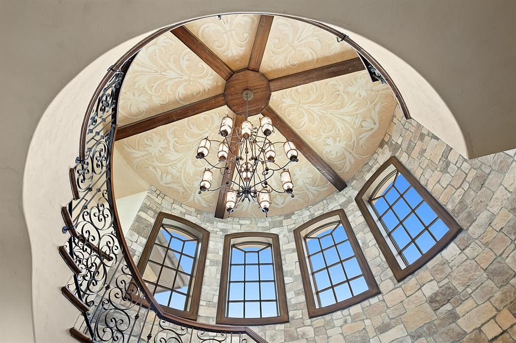 The entry foyer features a grand spiral staircase with an intricately designed wrought iron railing. Above, a stunning chandelier hangs from a wood-beamed vaulted ceiling, adorned with elegant floral motifs. The walls are accentuated with light-colored plaster that contrasts beautifully against the rich tones of the wooden beams. Natural light pours in through large, arched windows, framed in dark wood, showcasing the stonework surrounding them. The warm, earthy color palette creates a welcoming ambiance, while the combination of materials such as stone, wood, and metal adds a luxurious feel to the space, perfect for an inviting entrance.