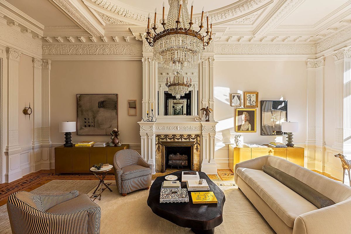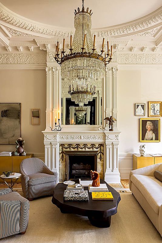 The living room showcases an elegant blend of classic and contemporary design. A grand chandelier hangs centrally, illuminating detailed plasterwork on the curved ceiling. A large, ornate white fireplace with intricate carvings adds a focal point, accented by a tall mirror reflecting light and space. Contemporary art pieces adorn the walls, while two stylish armchairs with subtle stripes and a plush sectional sofa invite relaxation. A unique, dark wooden coffee table contrasts against a light-colored area rug, enhancing the warmth of the room. Yellow cabinets add a pop of color, creating a sophisticated, inviting atmosphere.