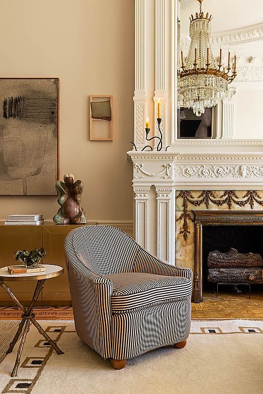 A cozy living room features a striking striped armchair accentuating comfort with its round shape and plush cushions. A delicate chandelier hangs from the ceiling, casting a warm glow, complemented by ornate moldings that add an air of elegance. The walls are painted a soft beige, providing a neutral backdrop for artistic elements, including a large abstract painting and a smaller framed work. A marble fireplace, detailed with intricate carvings and a lavish mantel, serves as a focal point. Nearby, a sleek side table holds decorative items, while a textured area rug grounds the space, tying together its stylish aesthetics.