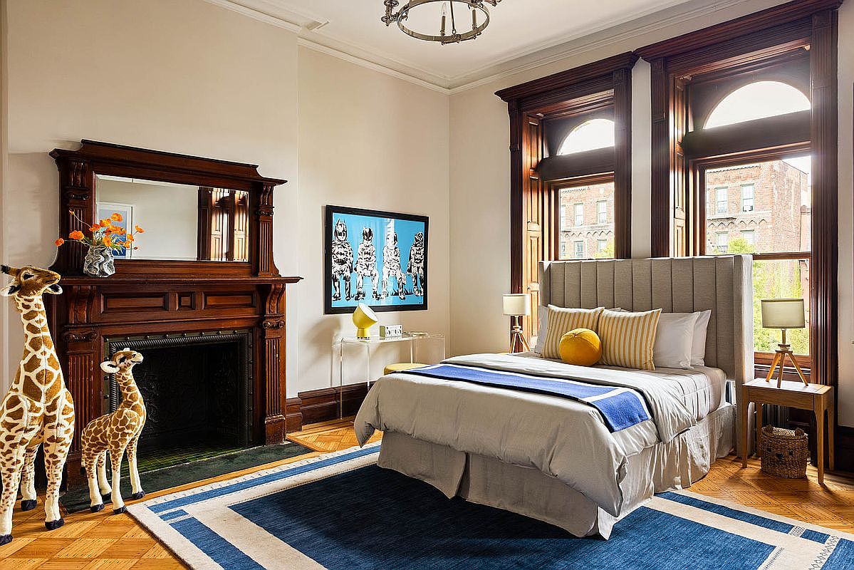 A chic bedroom featuring elegant architectural details and a warm color palette. The large windows, framed by rich brown wood, enhance the lightness of the room. A plush bed with a tufted beige headboard is layered with soft, inviting bedding in shades of gray and blue, topped by decorative pillows, including a vibrant yellow round pillow. To the side, stylish bedside lamps with wooden bases illuminate the space. An ornate wooden mantelpiece adds a touch of sophistication, complemented by quirky giraffe figurines that introduce playful charm. A textured blue area rug anchors the space, harmonizing with the hardwood flooring.
