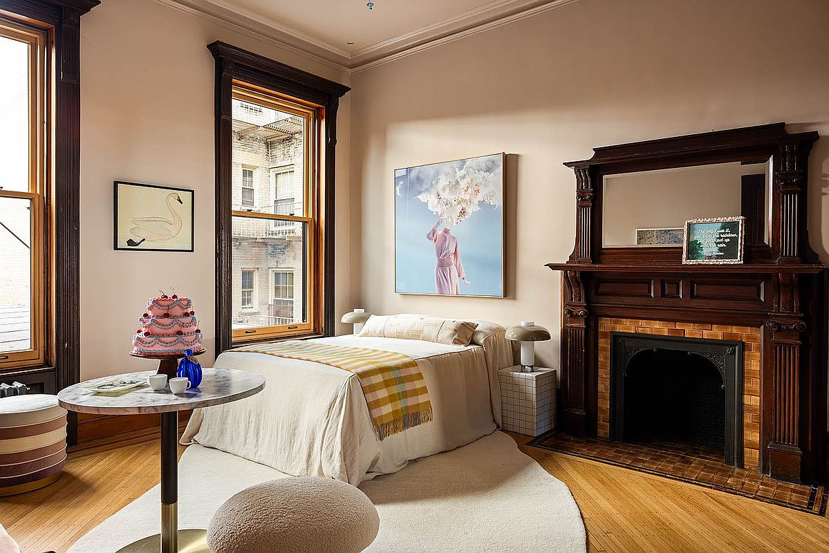 This cozy bedroom features a warm color palette with soft beige walls and rich wooden trim. A plush bed is adorned with a light-colored blanket and vibrant plaid throw, while a stylish round area rug adds softness underfoot. Windows on two sides invite natural light, enhancing the space’s inviting ambiance. A vintage mantel, embellished with intricate woodwork, frames a charming fireplace, creating a focal point. Nearby, a sleek side table with a marble top complements a whimsical pink cake display and artistic decor. A modern artwork featuring a figure with clouds adds a creative touch, balancing classic and contemporary elements.