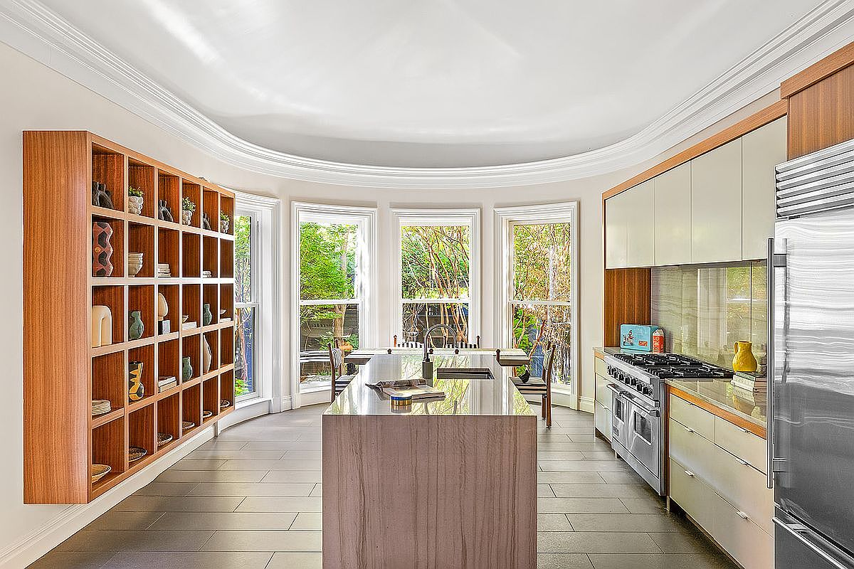 A modern kitchen featuring an open layout with large bay windows that flood the space with natural light. The cabinetry combines sleek, minimalist design with warm wood textures, particularly the rich tones of the shelving unit that holds decorative objects and dishware. A spacious island with a polished marble top serves as a central gathering point, contrasted by contemporary stainless appliances. The floor boasts large, dark tiles, enhancing the modern aesthetic while grounding the light color scheme. Unique architectural elements like the curved ceiling add an elegant touch, enhancing both functionality and visual appeal.