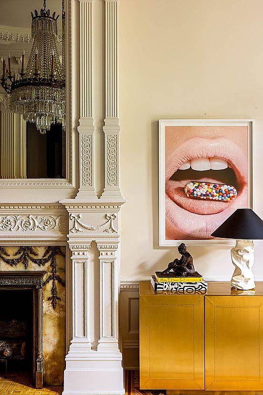 The living room showcases a blend of traditional and contemporary design elements. Ornate white crown molding and a grand fireplace with intricate carvings frame the space, while a large, eye-catching mirror adds depth. A striking artwork featuring a playful depiction of lips and candy contrasts with the neutral wall color. Golden cabinetry reflects light and adds warmth, complemented by sleek modern furnishings. A black lamp provides a bold accent, and a small sculpture adds a touch of artistry. The room boasts elegant chandeliers, enhancing the luxurious atmosphere, while the overall aesthetic feels both refined and inviting.