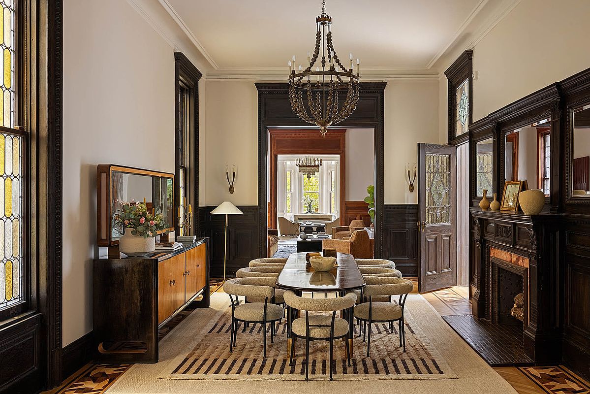 This dining room features elegant dark wood paneling and intricate moldings, enhancing its historic charm. A long rectangular table of dark marble is surrounded by plush, round chairs upholstered in a soft, beige fabric, evoking comfort. Above, a striking chandelier made of wooden beads adds sophistication. Light filters through large bay windows, illuminating the space and highlighting decorative accents, including a modern sideboard with a polished finish. The patterned area rug anchors the room, contrasting beautifully with the hardwood flooring. The harmonious blend of classic and contemporary styles creates a warm and inviting atmosphere.