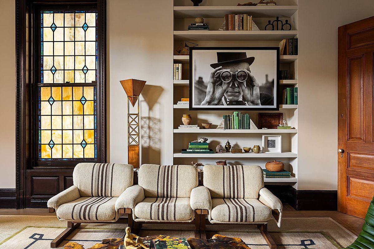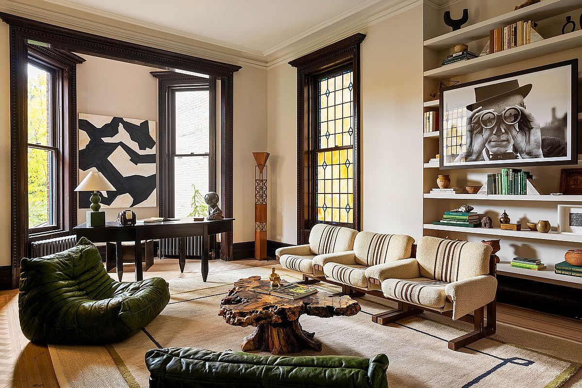 This inviting living room features a harmonious blend of vintage and contemporary design. The color palette includes warm neutrals with green accents, highlighted by plush, oversized bean bag chairs and a unique coffee table made from a wooden slab. Natural light floods through large windows, creating a bright atmosphere. The walls are adorned with a striking black and white artwork, while the built-in shelves display an eclectic mix of books and decorative items. Rich wooden trim and elegant stained glass windows add character, enhancing the room’s charm and nostalgia.