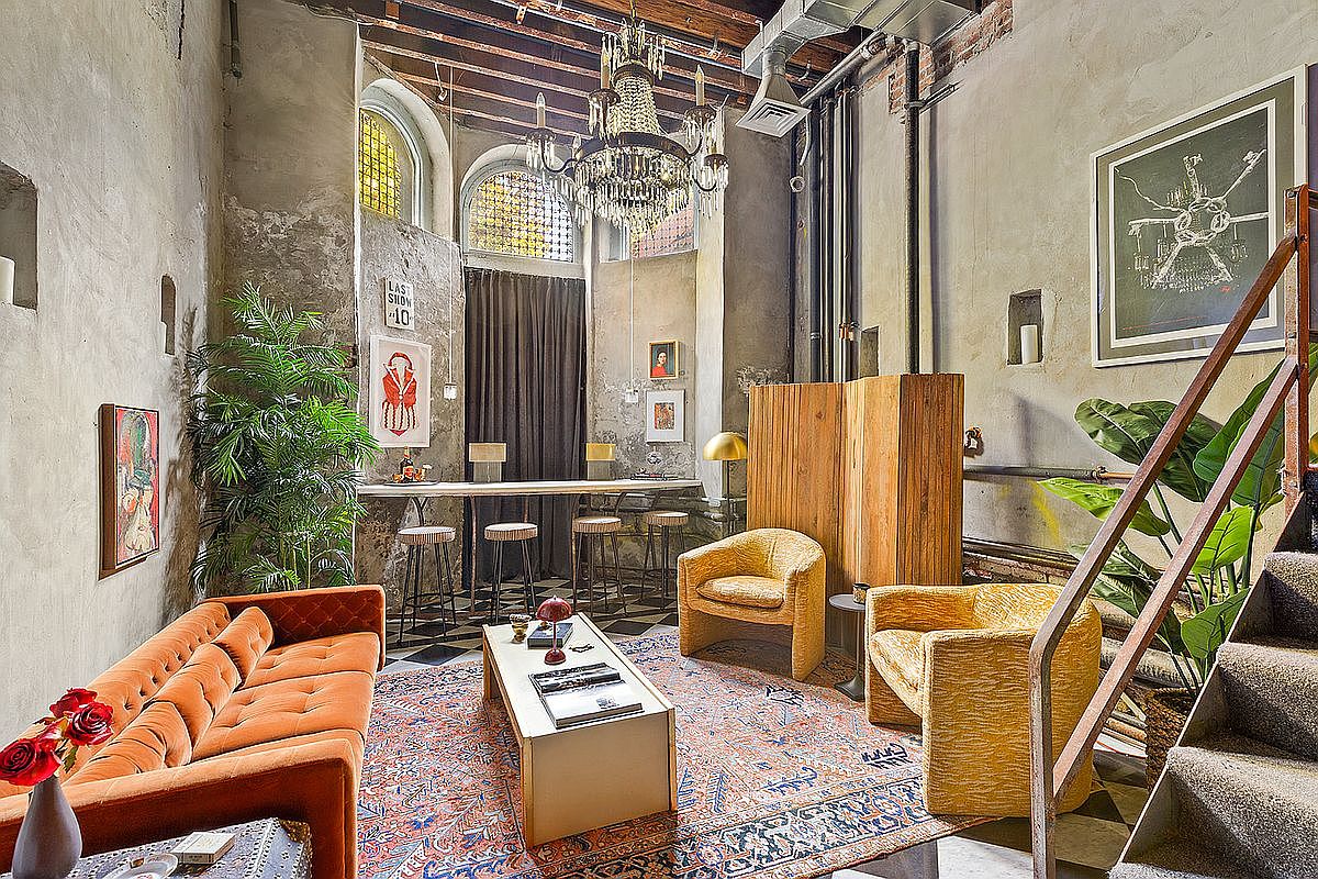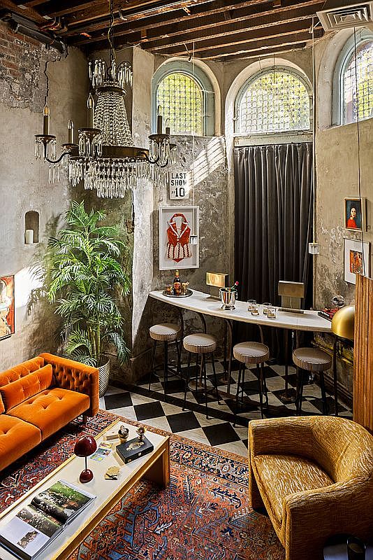 A vibrant living room blends vintage charm with modern flair. The space features a rich burnt orange velvet sofa, complemented by a textured yellow accent chair. Below, a large patterned area rug in deep reds and blues anchors the seating area, resting on a striking black and white checkered floor. A sleek, white bar-style table runs along one side, topped with minimalist decor and surrounded by tall, cylindrical stools. Industrial-style lighting from a sparkling chandelier adds elegance, while large, arched windows allow natural light to pen through, enhancing the room’s eclectic artworks adorning the rough concrete walls.