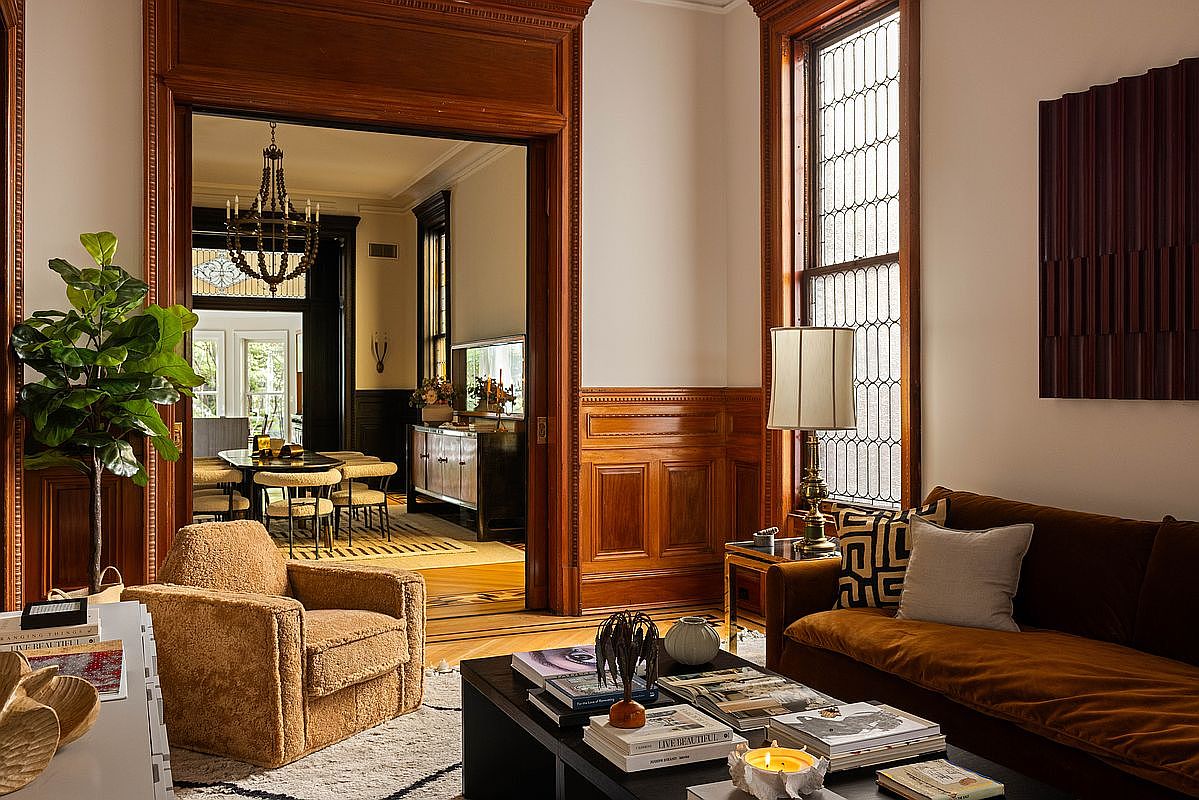 This living room showcases a blend of classic and contemporary design elements. Rich wooden paneling complements the warm, neutral walls, creating an inviting atmosphere. A plush, caramel-colored chair and a deep brown sofa upholstered in velvet provide cozy seating. The coffee table is adorned with art books and a decorative candle, adding character. A stylish lamp stands beside the sofa, contrasting with the geometric-patterned throw pillow. In the background, a chandelier hangs above the adjacent dining area, visible through an elegant archway. A potted plant adds a touch of greenery, enhancing the room’s overall warmth and sophistication.