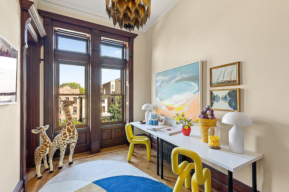 This inviting home office features a bright and airy corner layout, highlighted by large, elegant wooden windows that allow natural light to flood the space. The walls are painted a soft beige, accentuating the rich dark wood of the window framing and trim. A sleek white desk is positioned against the wall, paired with quirky yellow chairs that add a playful touch. Decorative elements include a colorful abstract painting, framed nautical art, and whimsical giraffe sculptures, creating a fun, creative atmosphere. A plush, circular rug with a vibrant pattern anchors the room, contributing warmth and visual interest.