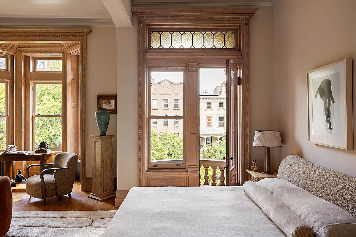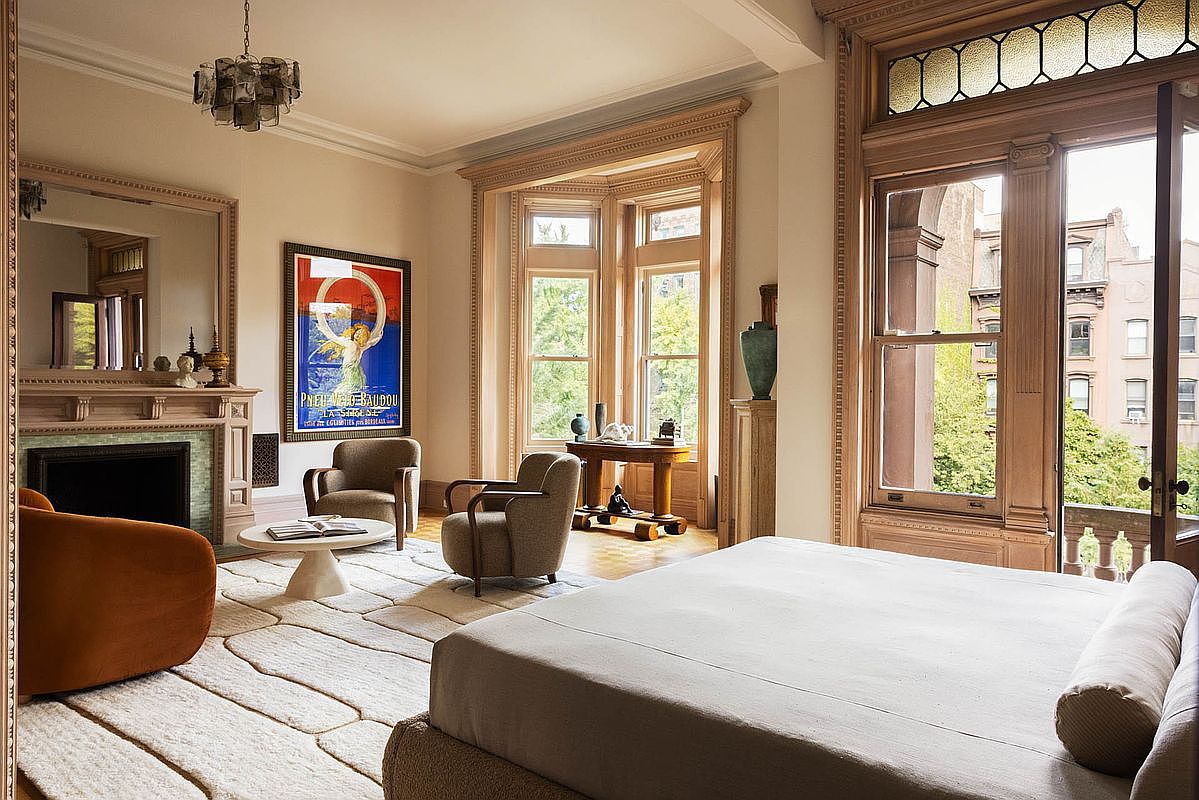 This elegant bedroom features a subtle color palette with beige walls accented by natural wood trim surrounding large windows. The large bed with a simple linen duvet is positioned centrally, offering a serene focal point. Flanking the bed are two stylish armchairs in muted tones, providing a comfortable seating area. A round coffee table sits beneath a striking artwork that brings a pop of color to the space. The hardwood floor is covered with a plush, textured area rug, enhancing the cozy atmosphere. Elegant details like a vintage chandelier and a sculptural vase on the mantel add sophistication.