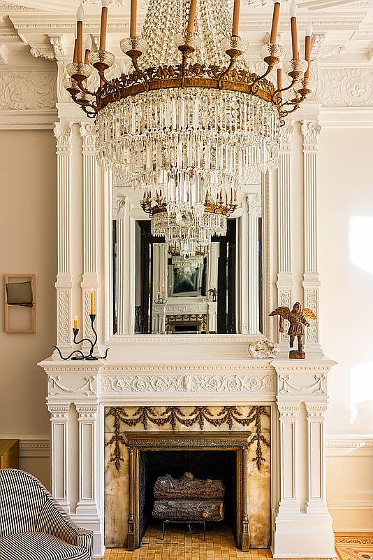 A grand fireplace mantel serves as the focal point, adorned with intricate white moldings and decorative details. Above it, an elegant chandelier covered with crystal prisms cascades down, complemented by vintage-style candles. The mantel features a reflective mirror that enhances the room’s brightness and depth. Richly patterned tiles surround the fireplace, creating warmth against the cream walls. An artistic sculpture and a small decorative object rest atop the mantel, adding character. A plush, striped armchair nearby invites comfort and leisure, harmonizing with the overall sophisticated aesthetic of this historic space.