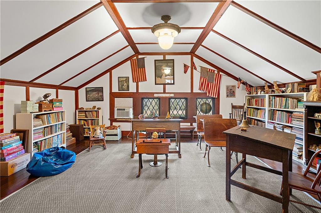 A cozy library study featuring a sloped ceiling with wooden beams. The rich, dark wood paneling adds warmth, complemented by the light-colored wall above. Various bookshelves filled with a diverse array of books border the room. An antique desk sits in the center, surrounded by wooden chairs, creating a scholarly atmosphere. A blue bean bag enhances the seating options, inviting relaxation. Decorative American flags and framed art adorn the walls, showcasing a patriotic theme. The large windows let in ample natural light, highlighting the textured carpet and the overall inviting ambiance of this charming space.
