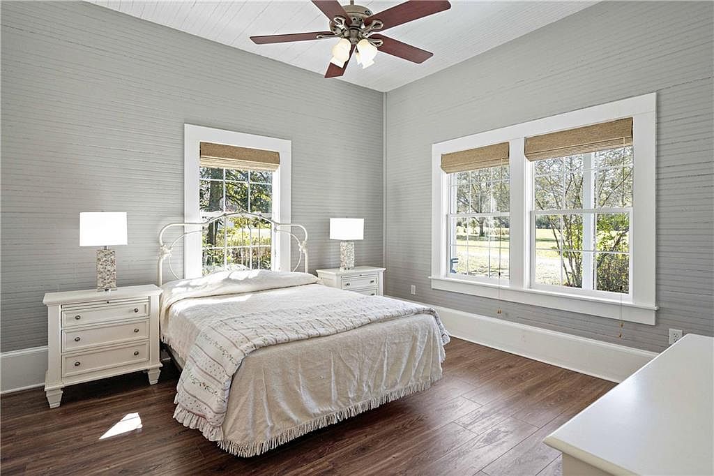 This cozy bedroom features soft gray walls that enhance a calming atmosphere. A vintage white metal bed sits elegantly against the wall, adorned with a light beige throw blanket. Flanking the bed are two white nightstands, each topped with stylish table lamps that provide gentle lighting. Large windows, dressed with woven shades, invite natural light, creating a warm, inviting space. Dark hardwood flooring contrasts beautifully with the lighter decor, while the beadboard ceiling adds a touch of classic charm. Simple yet effective, the design promotes relaxation and tranquility, making it an ideal sanctuary for rest.