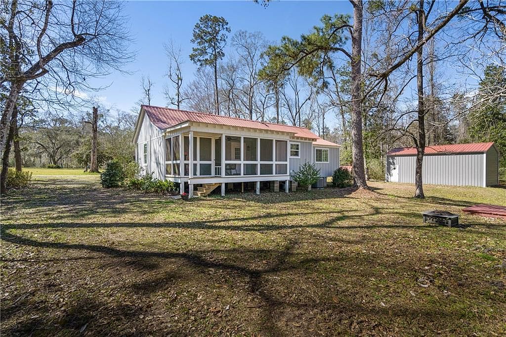 This historic American home features a charming exterior with a light-colored facade and a vivid red metal roof. A welcoming porch with a screened-in area provides a cozy spot to relax, adorned with multiple windows that invite natural light. The surrounding landscape is lush, with tall trees and manicured shrubs framing the property. A gravel path leads to a detached shed, maintaining the rural aesthetic. The expansive lawn is dotted with patches of sunlight filtering through the branches, enhancing the tranquility of this inviting outdoor space. Overall, the design complements the serene environment, showcasing classic American architectural elements.