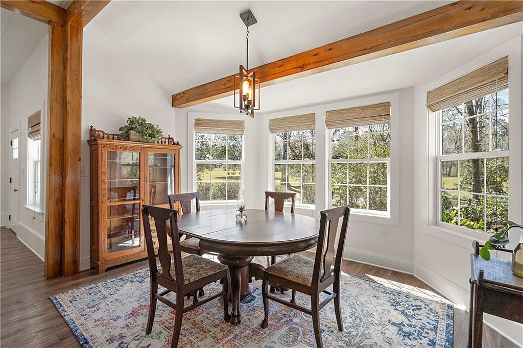 This dining area features a round wooden table at its center, surrounded by four wooden chairs with fabric cushions. A large, ornate china cabinet made of rich wood stands against the left wall, accentuating the space’s vintage charm. The room is bathed in natural light from expansive bay windows adorned with natural woven shades, showcasing the outdoor greenery. Exposed wooden beams add warmth and character to the ceiling, while the floor displays wide planks in a warm brown hue. A decorative area rug with intricate patterns anchors the table, creating an inviting atmosphere for gatherings.
