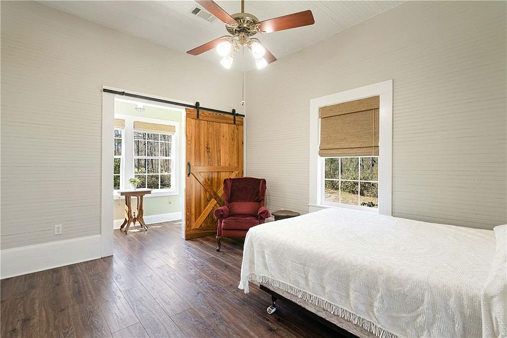 This bedroom features a calming layout with soft, neutral tones throughout. The walls are painted a light beige, accentuating the cozy atmosphere. A white quilt covers a simple bed, inviting rest. To the side, a plush, deep red recliner enriches the aesthetic, providing a pop of color. The room boasts a large sliding barn door made of rustic wood, adding a charming country element, while modern windows allow ample natural light, complemented by woven shades that bring warmth. A small round table sits near the window, perfect for a morning cup of coffee or a book.