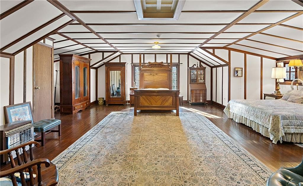 This spacious bedroom features a traditional aesthetic with a high, slanted ceiling adorned with exposed beams. The walls, painted white with dark wooden trim, create a warm contrast. A large, ornate wooden bed is the focal point, complemented by vintage furniture including an elegant dresser and mirrored armoire. A patterned area rug adds softness underfoot, while large windows allow natural light to flood the space. Light-colored bedding and a plush armchair invite relaxation. Decorative accents, such as a bedside lamp and framed artwork, enhance the room’s character, making it a blend of comfort and historic charm.