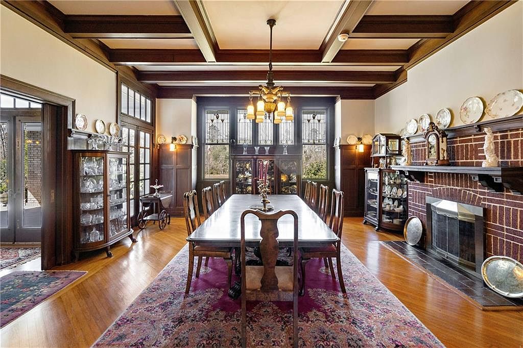The dining room features an elegant long wooden table surrounded by intricately designed chairs, all set on a rich, patterned rug that adds warmth. A coffered ceiling enhances the classic architecture, with beams in a deep wood tone. The walls are adorned with wainscoting, creating a sophisticated feel. A stunning chandelier hangs above, casting a warm glow. Glass cabinets showcase fine china and decorative plates, while a fireplace with a stylish mantle adds to the room’s charm. Large windows let in natural light, offering views of the gardens outside, complementing the refined, historic ambiance.