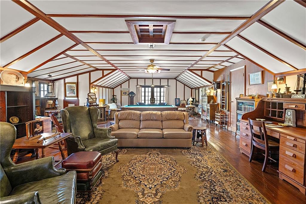 This spacious living room features a vaulted ceiling with exposed wooden beams and a light color palette that enhances natural light. The seating area includes a soft, beige leather sofa complemented by dark green, high-backed armchairs, creating a cozy yet sophisticated atmosphere. A richly patterned area rug anchors the space, providing comfort and warmth. Behind the sofa, a vintage desk and chair set adds a touch of functionality, while shelves lined with decorative items reflect the home’s historic charm. Large windows adorned with simple drapes allow for ample light, making the room both inviting and airy.