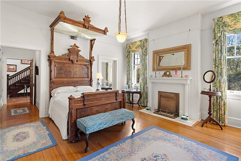 This spacious bedroom features a grand wooden four-poster bed with intricate carvings, paired with a blue upholstered bench at its foot. Light streams in through large windows adorned with floral curtains, enhancing the warm ambiance. A classic fireplace sits across from the bed, bordered by a white mantle and a large ornate mirror above, reflecting the elegance of the space. Rich wooden flooring contrasts with the soft pastel rugs beneath, adding warmth. A vintage side table holds a lamp and a round mirror, contributing to the room’s charm. Overall, the design blends historic elegance with inviting comfort.