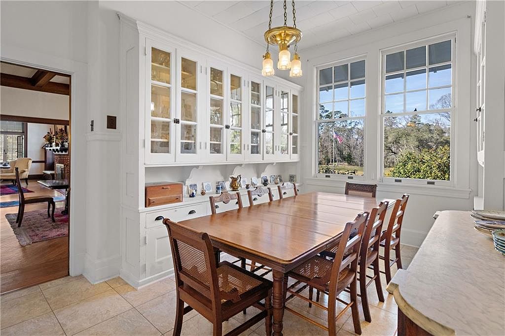 This dining room features a large wooden table surrounded by wicker-backed chairs, inviting gatherings and conversation. The space is brightened by natural light streaming through tall windows adorned with simple sheer curtains. A built-in china cabinet with glass doors showcases fine china and decorative items, set against white shiplap walls. The beige tiled floor adds warmth, while overhead, a vintage-style chandelier with three glass shades provides ambient lighting. Architectural details include a tongue-and-groove ceiling and a partial wall that reveals a cozy adjacent room, enhancing the open yet intimate feel of this inviting dining area.