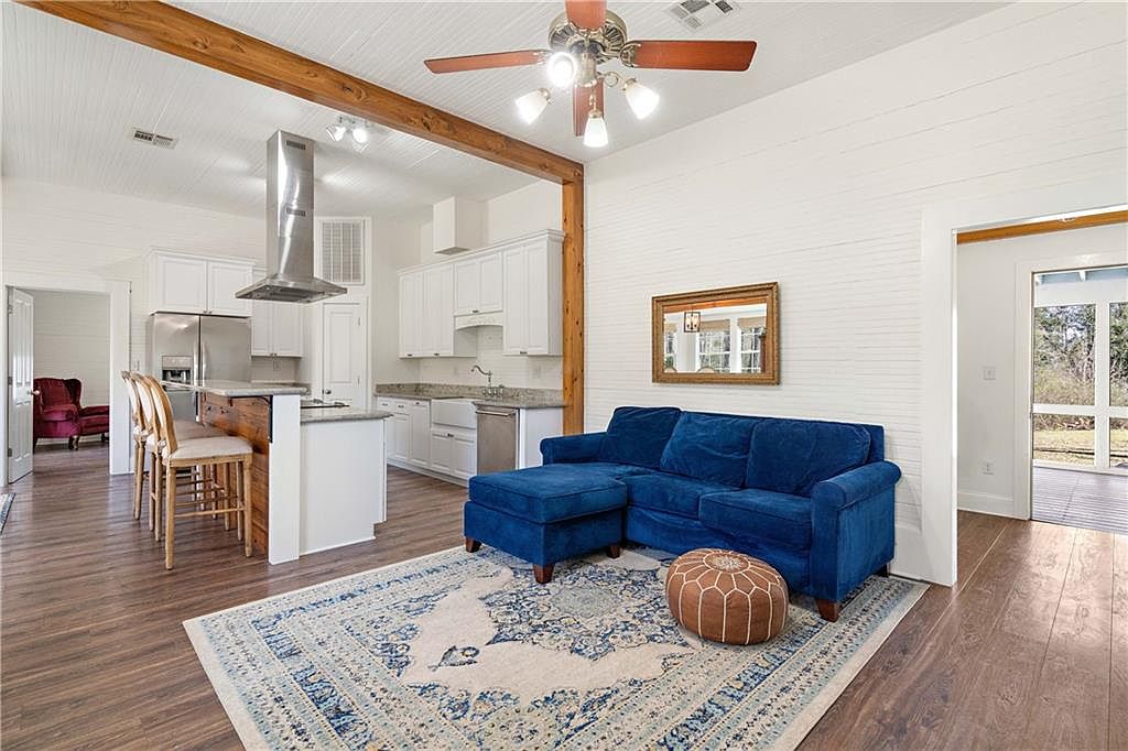 This space features a cozy living room with an inviting layout, seamlessly connecting to the kitchen. The dominant blue sectional sofa offers comfort, paired with a traditional patterned rug that adds color and warmth. Light wood accents, such as the ceiling beams and dark wood flooring, create a rustic yet modern feel. A stylish ceiling fan enhances airflow, complementing the airy atmosphere created by the bright, neutral walls. The kitchen area showcases white cabinetry and granite countertops, enhancing the clean aesthetic. A round pouf adds a playful element while a mirror reflects light, enhancing the openness of the room.