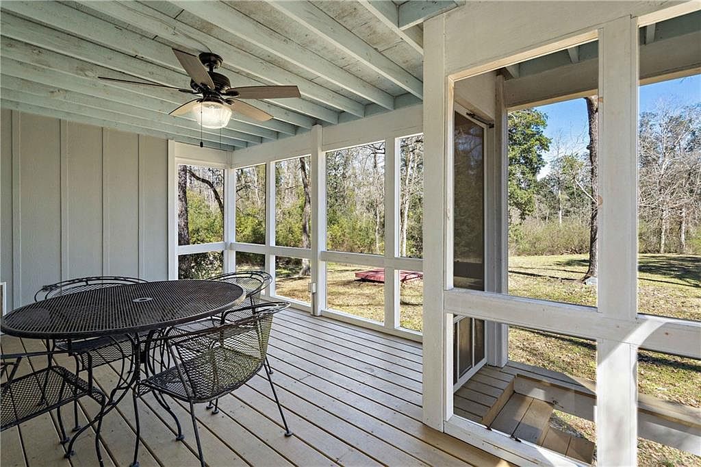 This sunroom features a cozy, inviting atmosphere with a light blue ceiling that complements the soft gray walls. The wooden floorboards are polished and provide a warm base. A circular black metal table is surrounded by stylish wire chairs, enhancing the modern yet rustic feel. Large windows, framed in white, invite ample natural light and offer views of the serene outdoor landscape filled with trees and greenery. A ceiling fan with a light fixture adds functionality and charm, making this space ideal for relaxation or dining while enjoying the gentle breeze and picturesque views.