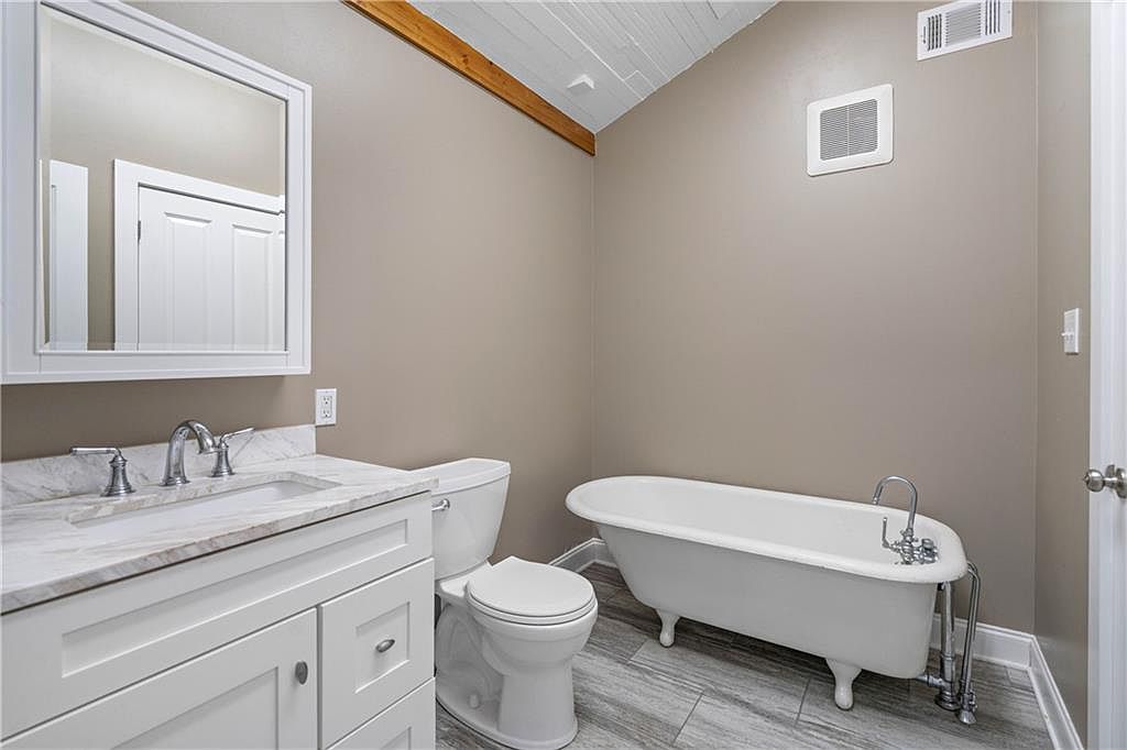 This cozy bathroom features a clawfoot tub that adds vintage charm, contrasting beautifully against the smooth, light-colored walls. A white vanity with a marble countertop offers a touch of elegance, while the chrome fixtures provide a modern finish. A large, framed mirror above the sink reflects ambient light, enhancing the spacious feel of the room. Natural wood beams stretch across the ceiling, adding warmth to the design. The gray tile flooring complements the overall neutral color scheme, creating a serene atmosphere perfect for relaxation. An efficient layout ensures easy access to all fixtures without feeling cramped.