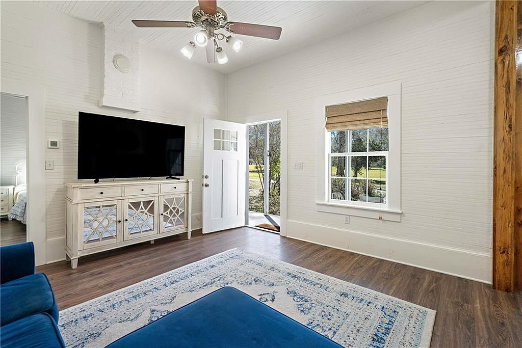 This bright living room features a cohesive blend of modern and rustic elements. The white shiplap walls provide a fresh, airy ambiance, complemented by a rich wooden floor that adds warmth. A large flat-screen TV is mounted on the wall opposite a stylish white console table, which showcases intricate geometric designs. To the right, a door leads outside, adorned with a cozy window treatment that filters natural light. A dark blue sectional sofa and matching area rug enhance the inviting atmosphere, while exposed wooden beams highlight the space’s historical charm, creating a perfect balance of style and comfort.