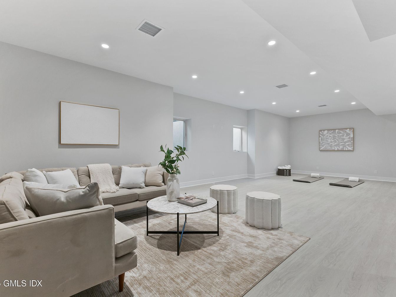 This spacious living room has a neutral color palette featuring soft gray walls and light wooden flooring. A modern couch is adorned with white and beige cushions, providing a cozy seating area. A round marble coffee table sits centered in front of the couch, enhancing the contemporary feel. To the right, minimalist poufs offer additional seating or decorative accents. Art pieces on the walls, framed in simple wooden borders, contribute to an airy atmosphere. Recessed lighting illuminates the space evenly, creating a warm, inviting ambiance perfect for relaxation or gatherings.