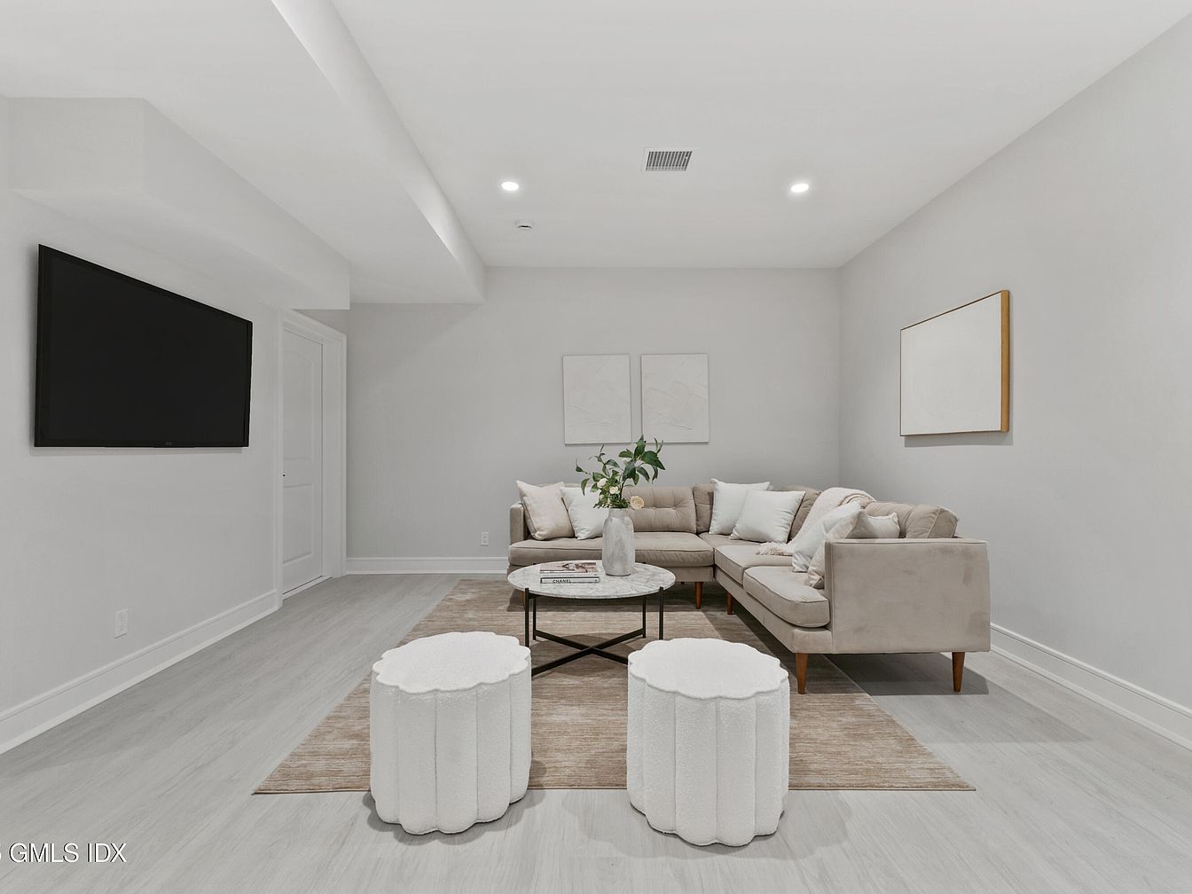 A cozy living room with a serene, modern aesthetic. The space features soft gray walls and light wood flooring, contributing to a bright and airy atmosphere. A plush L-shaped sectional sofa in a muted beige dominates one corner, adorned with decorative pillows. In front, a round coffee table with a marble top is surrounded by two chic, white poufs that evoke a playful charm. A large flat-screen TV is mounted on the wall opposite, while minimalist artwork in soft hues hangs nearby, enhancing the contemporary feel. This inviting area seamlessly blends comfort and style.