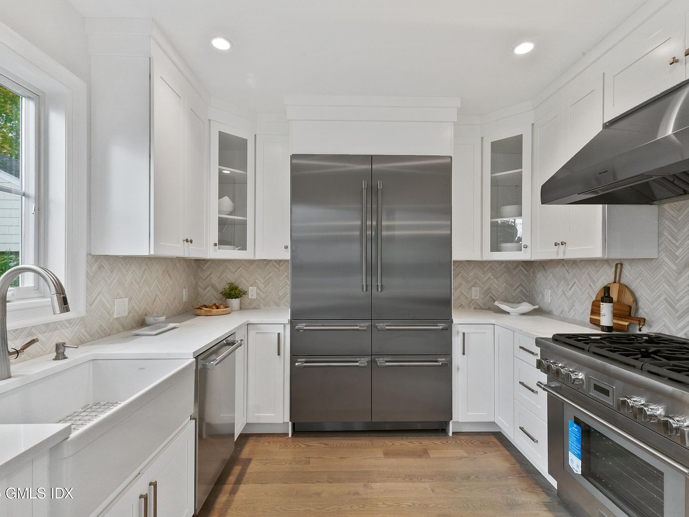 Bright and modern kitchen featuring sleek white cabinetry that reflects a contemporary aesthetic. The layout includes a large, stainless steel refrigerator and a professional-grade gas range, both providing a polished look. The herringbone patterned backsplash complements the countertops, which are seamlessly integrated, enhancing the sophisticated design. Natural light floods in through the window, highlighting the warm wood floors and creating an inviting atmosphere. Decorative accents, such as a bowl of fresh fruit and simple white dishware, add functional charm without detracting from the clean lines and airy feel of the space.