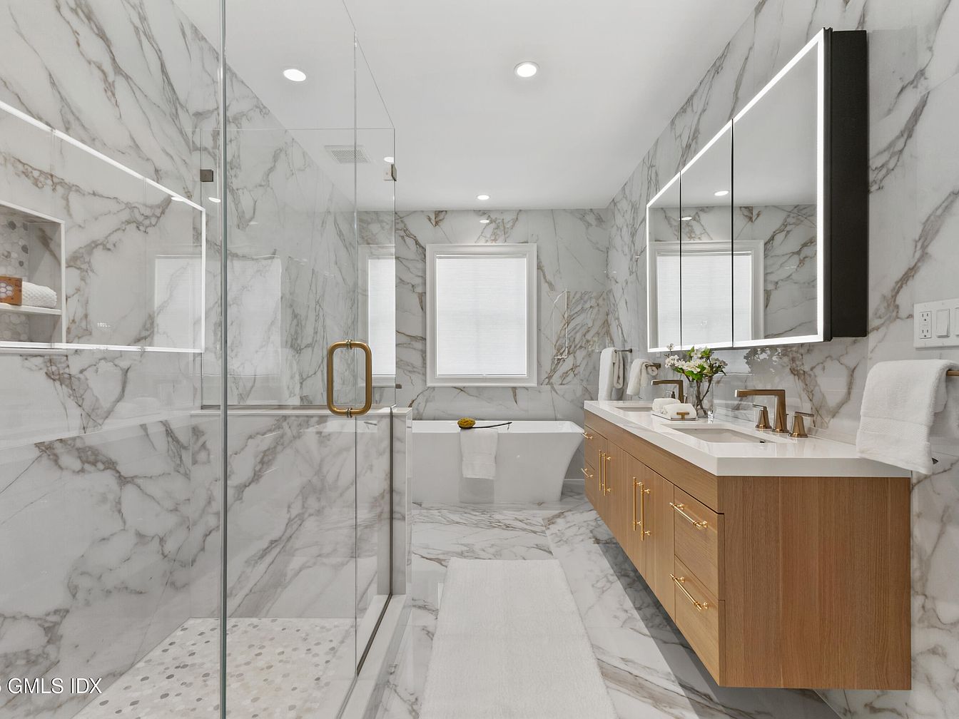 This elegant bathroom features sleek marble walls with delicate veining in a soft gray and white palette, enhancing a sense of spaciousness. A large glass shower enclosure showcases a modern, gold-accented handle and a custom showerhead. Opposite, a free-standing soaking tub invites relaxation, positioned beneath a window that offers natural light. The custom wooden vanity showcases a warm finish, complemented by gold hardware, and is topped with a white countertop, ensuring a polished look. Minimalist decor elements, including fresh flowers and neatly arranged towels, add a touch of sophistication, while recessed lighting creates an inviting atmosphere.