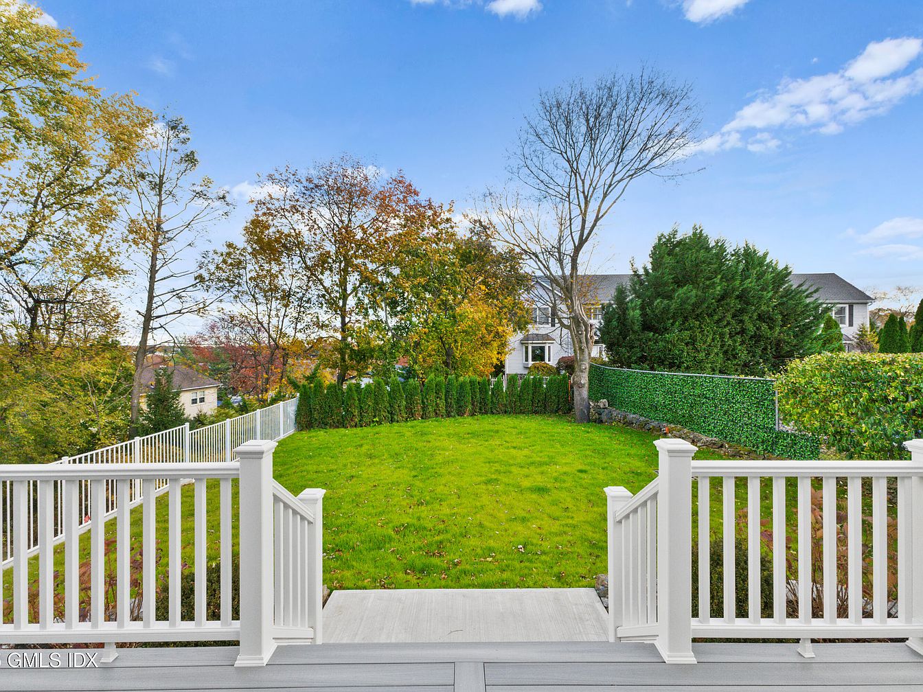 The image showcases a spacious backyard area. Lush green grass fills the expanse, bordered by manicured hedges and trees in vibrant autumn hues. A white wooden railing frames a set of steps leading down from a deck, creating a welcoming entrance to the outdoor space. The sky above is bright and clear, accentuating the natural beauty of the surroundings. In the distance, glimpses of neighboring houses are visible, adding context to the setting. The overall atmosphere conveys tranquility and openness, inviting relaxation and enjoyment of nature in this serene outdoor setting.