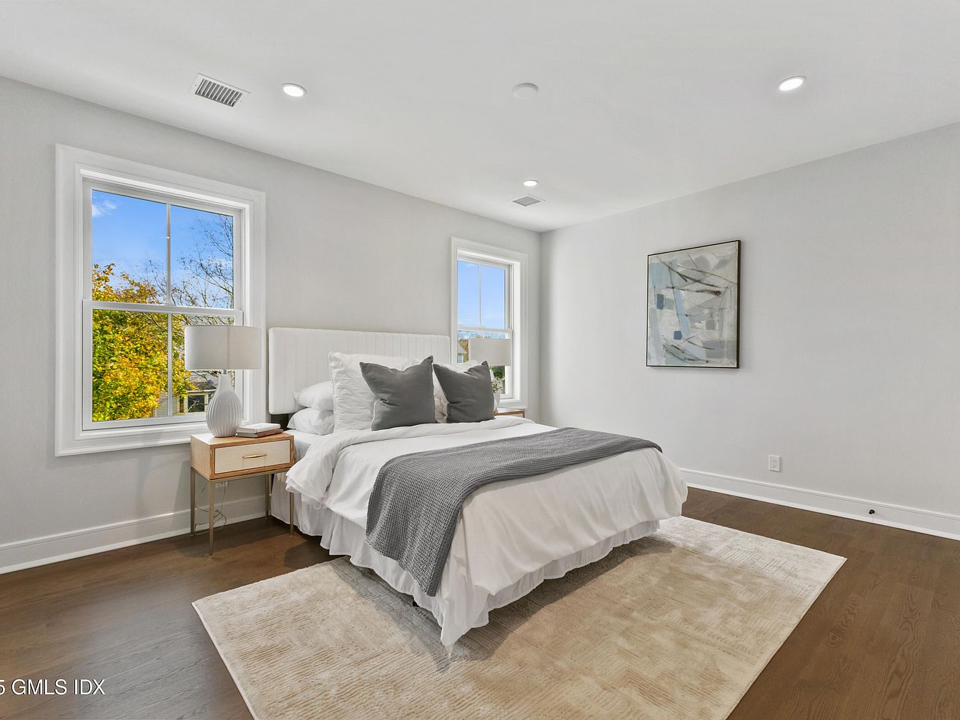 The image shows a serene bedroom with a calming design. A plush bed with a white duvet and decorative gray pillows is positioned centrally, complemented by a cozy gray throw blanket. Two large windows fill the space with natural light, framing views of green foliage outside. Nearby, a minimalist nightstand with a stylish lamp adds functionality and elegance. The walls are painted in a soft, light gray, enhancing the tranquility of the room, while dark hardwood flooring grounds the space. An abstract art piece on the wall introduces a hint of sophistication, contrasting subtly with the overall warmth of the room.