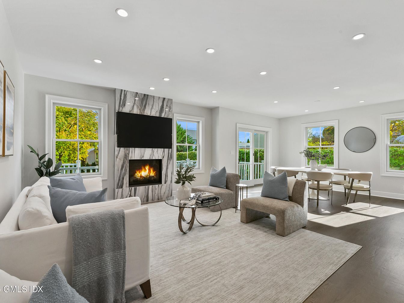 This contemporary living room showcases an open layout with neutral tones and natural light. A sleek marble fireplace serves as a striking focal point, accentuated by a flat-screen TV mounted above it. The furniture features a plush white sectional adorned with soft blue pillows, setting a calm atmosphere. Light wooden flooring complements the light gray area rug. A circular coffee table adds a modern touch, surrounded by two textured armchairs. The dining area off to the side includes stylish chairs and a minimalist table, while large windows frame picturesque views of greenery outside, enhancing the inviting ambiance.