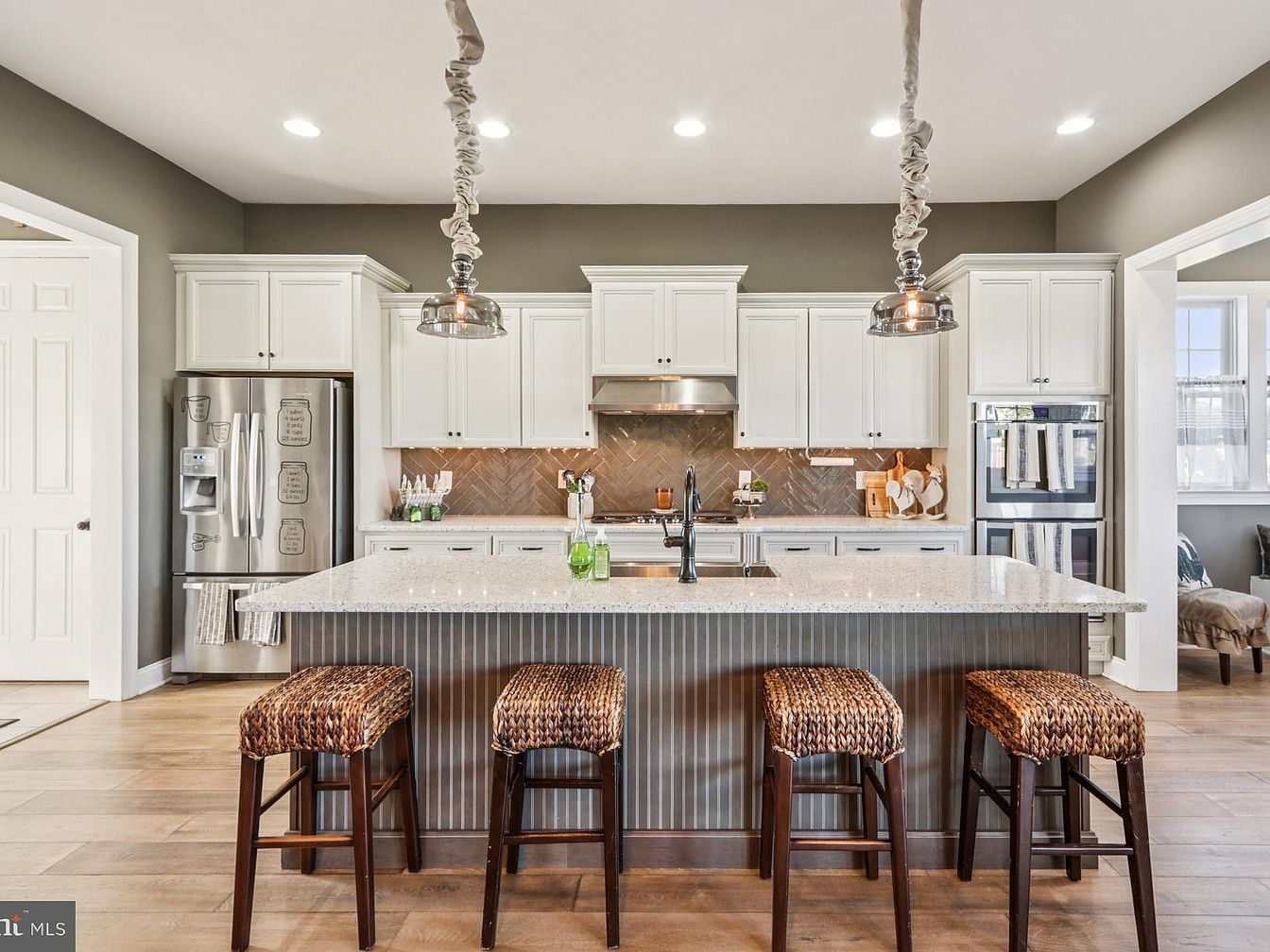 A spacious kitchen features a large central island with a speckled white countertop, gray beadboard paneling, and four woven stools with dark wooden legs. Above the island, two industrial-style pendant lights with metallic shades hang from the ceiling, their cords wrapped in fabric. White cabinetry lines the back wall, complemented by stainless steel appliances, including a double oven and a French door refrigerator. The backsplash is a herringbone-patterned tan tile, adding visual interest. Neutral walls and wide-plank light wood flooring create an airy, inviting atmosphere, while fresh greenery and stylish kitchen accessories add warmth and personality to the space.